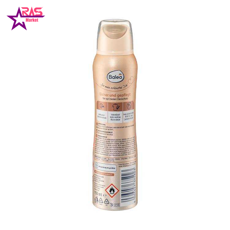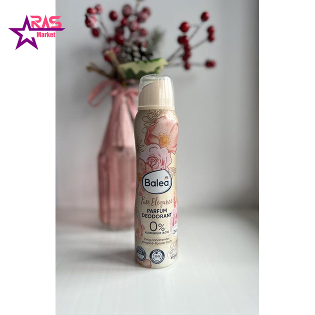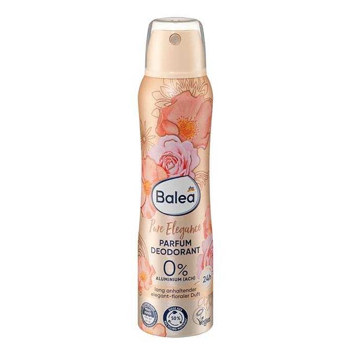 اسپری خوشبو کننده و ضد تعریق باله آ مدل Pure Elegance زنانه 150 میلی لیتر ( Balea Deo spray Parfum Deodorant Pure Elegance ) محصولی جدید و بسیار با کیفیت و پرطرفدار با رایحه ای فوق العاده و ماندگاری عالی تا 24 ساعت و با خاصیت کنترل و کاهش تعریق بدن برای مدت طولانی از برند مطرح باله آ آلمان می باشد. در واقع، این محصول یک اسپری ضد تعریق و خوشبو کننده بدن با کیفیت است که دارای رایحه دل انگیز گل های رز وحشی و شکوفه های یاس است و استفاده از آن نه تنها بدن را تا ساعت ها آراسته نگه می دارد بلکه با رایحه فوق العاده خود انرژی و آرامشی دل انگیز را به شما القا می کند.