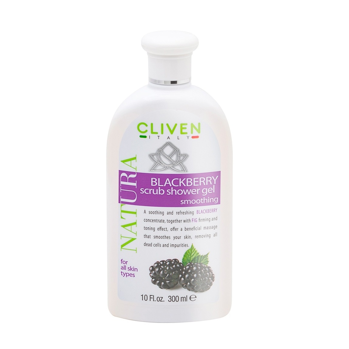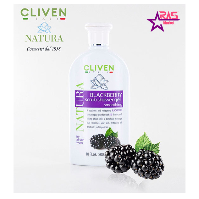 ژل شستشوی بدن کلیون لایه بردار حاوی عصاره شاه توت مناسب انواع پوست 300 میلی لیتر ( Cliven Scrub Shower Gel Blackberry Smoothing ) محصولی جدید و بسیار کاربردی و فوق العاده در جهت پاکسازی و لایه برداری و نیز شستشوی بدن از برند حرفه ای کلیون ایتالیا است. این محصول چند منظوره نه تنها یک شوینده فوق العاده است و پوست بدن را عمیقاً از چربی ها و آلودگی ها پاکسازی می کند بلکه با لایه برداری سطحی پوست، سلول های مرده و کدری و خشکی پوست را از بین برده و پوستی تمیز، روشن و سبک و با طراوت را به ارمغان می آورد.