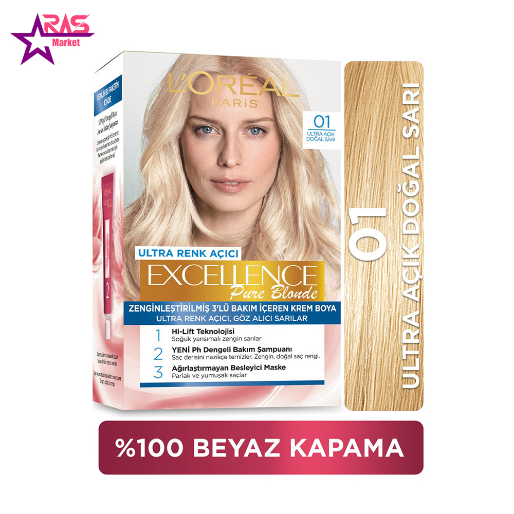 کیت رنگ مو لورآل سری Excellence Pure Blonde رنگ بلوند طبیعی خیلی روشن شماره 01 ( Loreal Paris Excellence Pure Blond 01 Ultra Light Natural Blonde Hair Dye ) محصولی جدید و بسیار با کیفیت و جذاب بخصوص برای علاقمند به موهای بلوند و خیلی روشن با ماندگاری فوق العاده و محافظت سه گانه از موها شامل قبل، در حین و بعد از رنگ کردن موها از برند تخصصی و با سابقه لورال پاریس می باشد. این محصول، پوشش دهنده کامل موهای سفید و یکدست کننده موها و نیز افزایش دهنده حجم، استحکام و مقاومت موها بوده و بهترین عملکرد را در هر بار استفاده خواهد داشت. در واقع، کیت رنگ مو شماره 01 لورال رنگ بلوند خیلی روشن با کیفیت هر چه تمام تر رنگی روشن، درخشان و ماندگار را برای شما حاصل خواهد نمود.