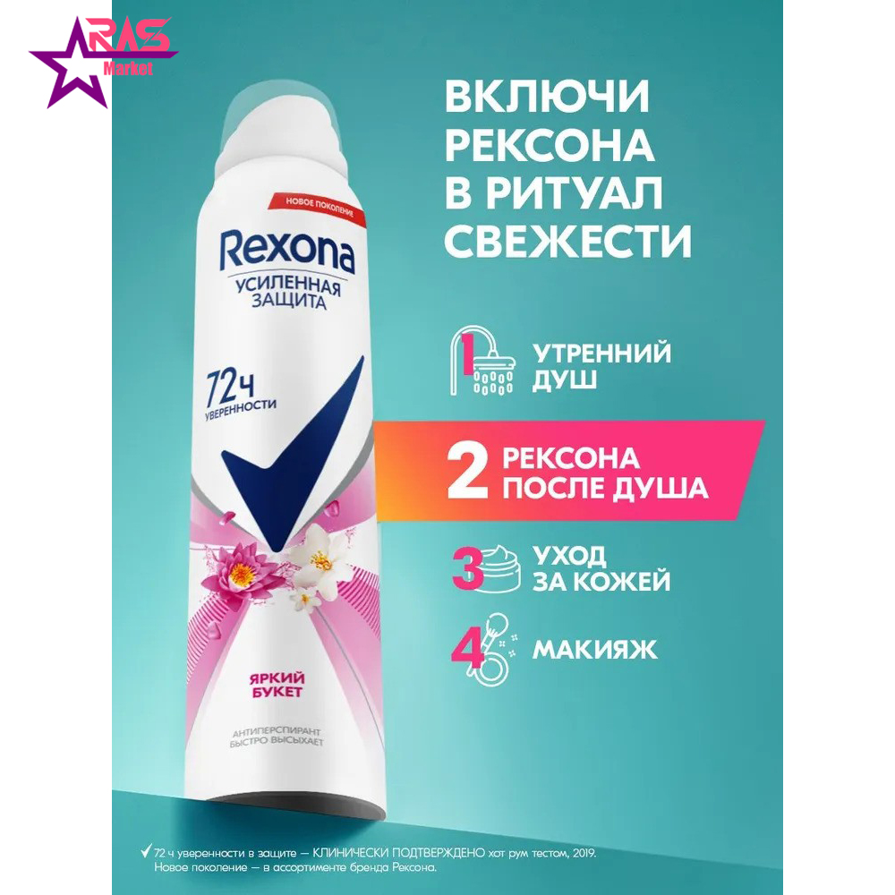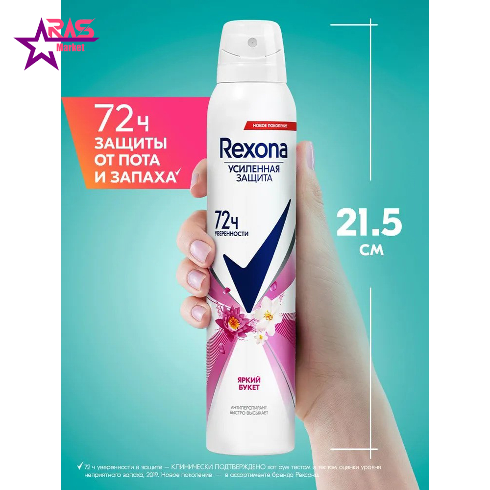اسپری ضد تعریق رکسونا روسی مدل Bright Bouquet زنانه 200 میلی لیتر ( Rexona Bright Bouquet Antiperspirant Deodorant Spray for Women russian ) محصولی حرفه ای و بسیار با کیفیت مخصوص بانوان و کاهش دهنده تعریق بدن و دارای رایحه ای انرژی بخش ترکیبی از گل های بی نظیر با ماندگاری طولانی تا 72 ساعت از برند با سابقه و مطرح رکسونا تولید کشور روسیه است. این محصول دارای جذب سریع است و با انواع پوست حتی پوست های حساس سازگاری کامل دارد. این محصول همچنین با کیفیت هر چه تمام تر از تعریق شدید بدن جلوگیری نموده و تا 72 ساعت اثرگذاری فوق العاده ای دارد.